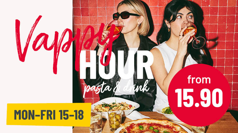 The offer is valid from August 4 to 17, 2025, at Vapiano Mikonkatu and Itis restaurants. The offer cannot be combined with already discounted dishes, such as lunch offers.